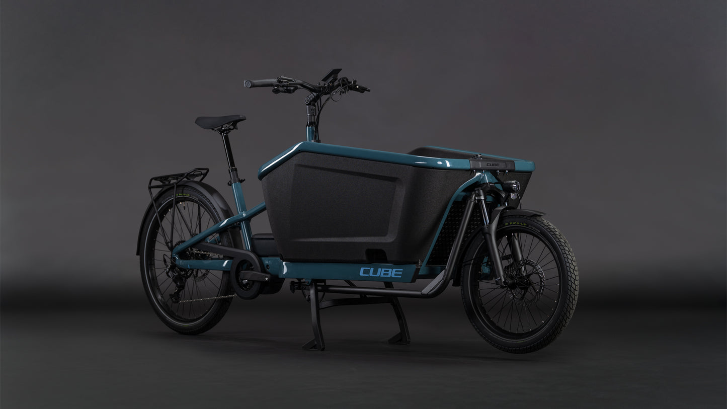 Wenn's um Lastentransporte per Zweirad geht, setzt das Cargo Hybrid 800 neue Maßstäbe. Dieser potente Packesel hat nämlich einen Heck-Gepäckträger und eine vielseitige Cargobox aus EPP-Schaum mit an Bord und schafft bis zu 200 kg Systemgewicht von A nach B. Optional gibt's eine Kindersitzbank mit integrierten Anschnallgurten für den flexiblen Einsatz als Familienkutsche. Dass das Ganze einfach zu fahren ist, versteht sich bei CUBE von selbst. Der leistungsstarke Bosch Cargo Line Motor samt 800 Wh Akku liefert mit bis zu 100 Nm Drehmoment erstklassige Unterstützung im Vorwärts. Der einfach bedienbare, breit gefächerte Shimano Cues 9-Gang Antrieb hat dabei für jede Situation per Klick den richtigen Gang parat. Dank hell leuchtenden LED-Lichtern vorne und hinten heißt es zu jeder Zeit: Sehen und gesehen werden. Bei Nässe leisten die Schutzbleche und griffigen Reifen erstklassige Dienste. Außerdem bringen die kraftvoll zupackenden hydraulischen Shimano Scheibenbremsen den Lastenprofi kontrolliert zum Stehen. Zum einfachen Abstellen gibt's einen superstabilen Mittelbauständer. Kurz: Egal was mit muss, dieses Bike kann's! Unser Cargo Hybrid ist ein echtes Arbeitstier, das den Transport von Lasten mit bis 200 kg Systemgewicht schafft. Sein langlebiger Aluminiumrahmen hat einen Aufnahmepunkt für den Bosch Cargo Line Motor, der im Team mit dem 800 Wh starken Akku bis zu 100 Nm Drehmoment bereitstellt. Wer noch mehr Kapazität und Reichweite braucht, kann per PowerMore Option weitere 250 Wh nachrüsten. On top gibt's jede Menge geniale Details. Die robuste Transportbox aus EPP-Schaum ist mit einer Gummimatte ausgelegt, was Geräusche dämpft und die Reinigung erleichtert. Dazu kommt ein kleines Staufach für persönliche Gegenstände. Clever: Per integriertem Schloss, das mit dem optionalen Kettenschloss kompatibel ist, lassen sich sowohl das Bike als auch das kleine Staufach absperren. Was noch? Der integrierte Kettenschutz hält die Kleidung sauber und per Mittelbauständer mit verlängerten Füßen wird das Bike ganz einfach abgestellt. Last, but not least haben wir das Steuersystem optimiert, wodurch der Wendekreis deutlich kleiner ist – für ein unkompliziertes, intuitives Fahrgefühl.