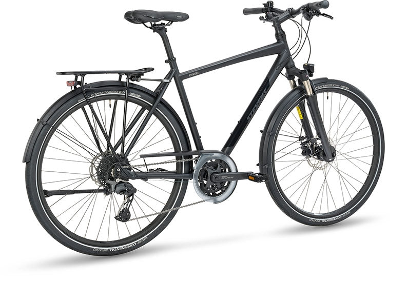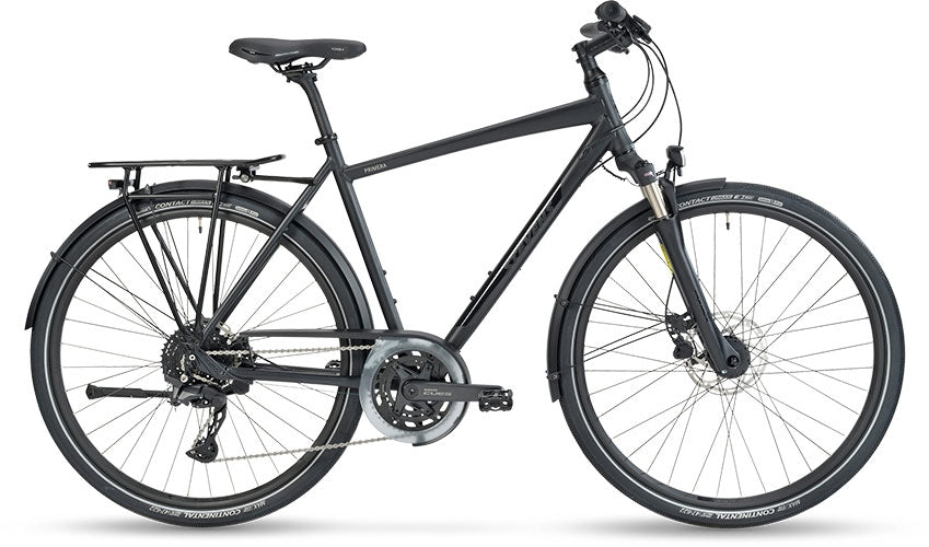 Wird es eine gemütliche Runde durch die Felder? Dann voran mit vollem Federweg. 63 Millimeter sind perfekt. Oder geht es rasant über bergige Sträßchen? Der Lockout legt die Feder still – und lässt Primera-Fahrerinnen und Fahrer ganz ungefiltert die Effizienz des leichten Aluminiumrahmens genießen. 100% Kontrolle garantieren dabei jederzeit die hydraulischen Tektro-Scheibenbremsen. Für jede Menge Bandbreite in jedem Terrain steht die Shimano CUES U6000 2x10-Schaltgruppe.